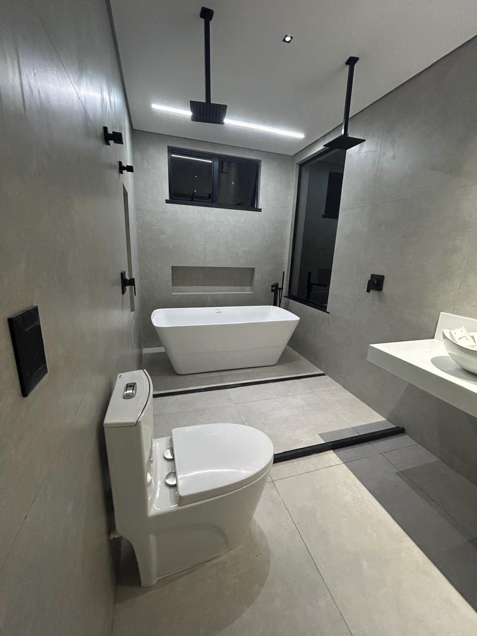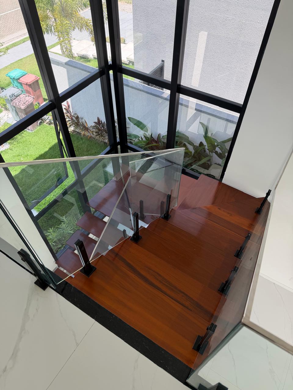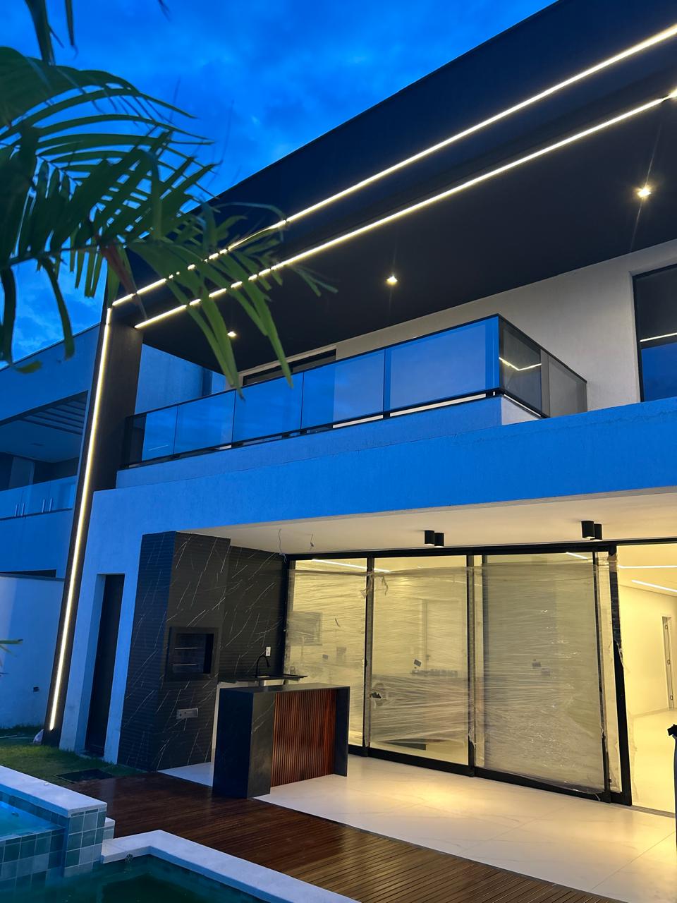 Residência de alto padrão com 267m² construídos. Arquitetura contemporânea de volumes pretos contrastados com iluminação linear LED integrada, vidro estrutural, madeiras nobres e pedras naturais. Integração absoluta entre social, íntimo e área de lazer com piscina.